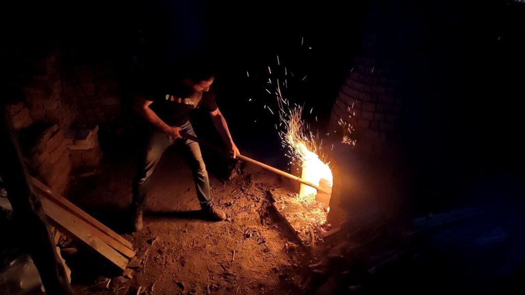 Este vorba, concret, despre construirea, în jurul unei vetre deja existente, pe care sunt așezate lucrările din lut, a unui cuptor din cărămizi refractare. Cuptorul se înalță atât cât e nevoie, în funcție de numărul lucrărilor, apoi este acoperit cu țigle care să mențină temperatura, dar să lase să iasă flăcările. După ardere și după răcirea naturală, lentă, cărămizile cuptorului sunt îndepărtate pentru a scoate ceramica.