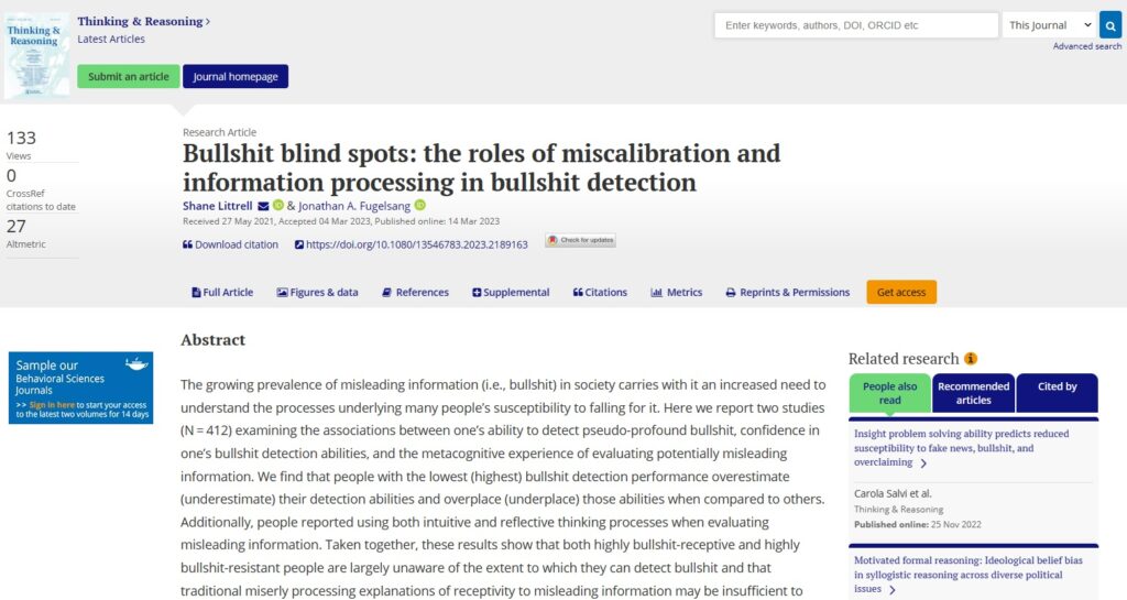 Un studiu recent sugerează că persoanele care cred despre ele că nu pot fi păcălite cu informații false sau nonsensuri sunt, de fapt, cele mai vulnerabile, în timp ce persoanele care își subestimează capacitatea de a detecta falsitatea informațiilor sunt cele mai eficiente în această privință. De asemenea, cei care se supraestimează, crezând că nu pot cădea victime dezinformărilor, sunt cei mai eficienți în răspândirea informațiilor false și nonsensurilor.