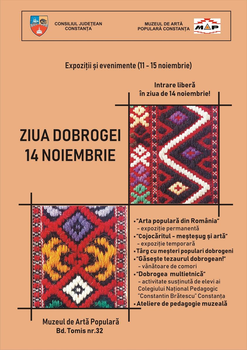 Muzeul de Artă Populară Constanța organizează timp de cinci zile, începând din acest weekend până miercuri, 15 noiembrie, o suită de manifestări, pentru toate vârstele, dedicate Zilei Dobrogei, Mai mult, pe 14 noiembrie, muzeul poate fi vizitat gratuit.