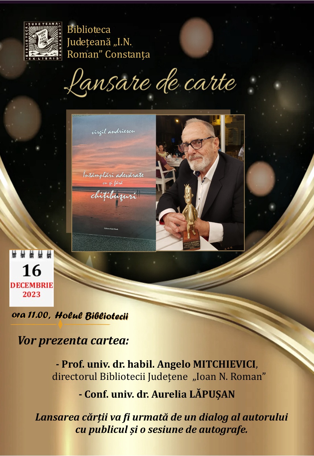 Biblioteca Județeană „Ioan N. Roman” Constanța găzduiește sâmbătă, 16 decembrie, de la ora 11.00, în foaier, un eveniment editorial de suflet: lansarea volumului „Întâmplări adevărate cu sau fără chițibușuri”, semnat de Virgil Andriescu.