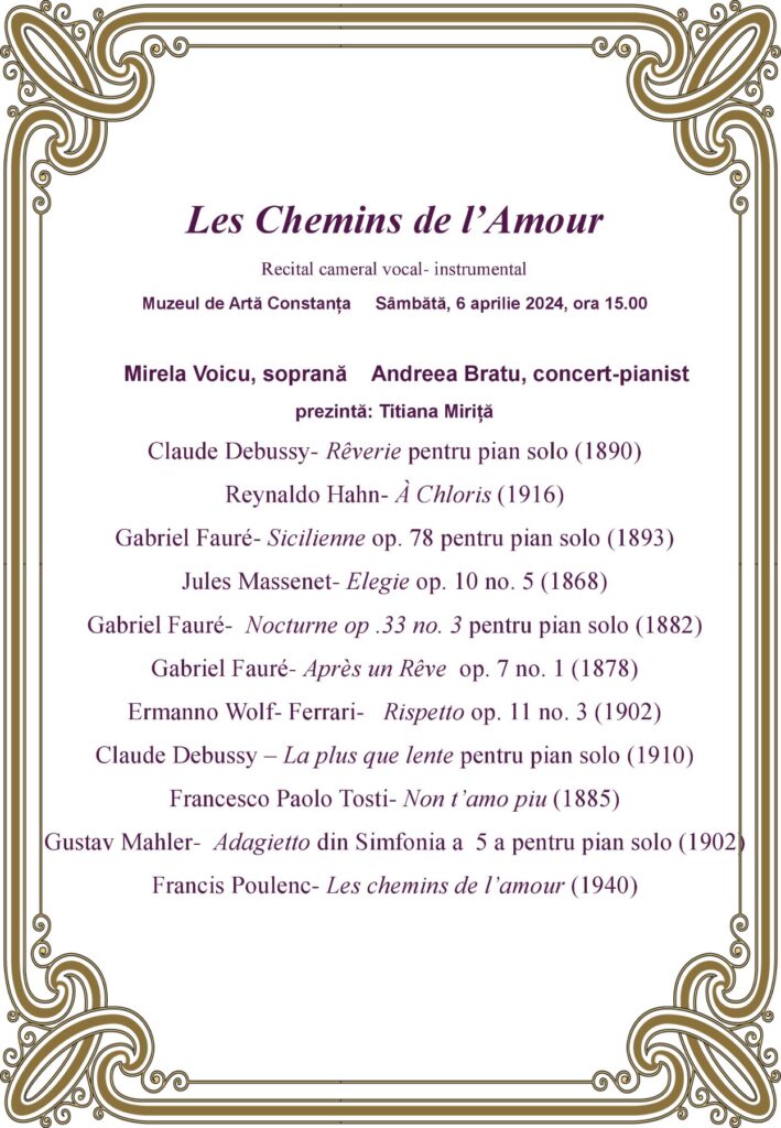 Recitalul „Les Chemins de l’Amour”, programat sâmbătă, 6 aprilie, de la ora 15.00, în sala „Nicolae Grigorescu” a Muzeului de Artă din Constanța, îi va avea ca soliști pe lect. univ. dr. Mirela Voicu – soprană și lect. univ. dr. Andreea Bratu – pian solo și acompaniament pianistic. Prezentarea evenimentului muzical va fi asigurată de asist.univ. dr. Titana Miriță.