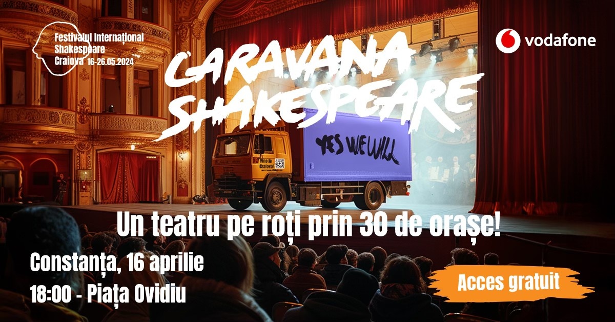 La Constanța caravana ajunge marți, 16 aprilie, la ora 18:00, în Piața Ovidiu, iar actorii Lucian Vlăsceanu, Adrian Tudor și Alexandru Gabriel Boboruță vor prezenta publicului spectacolul „Operele complete ale lui Shakespeare”, regia Alexandru Boureanu, traducerea și adaptarea Petre Bokor, scenografia Adelina Galiceanu. În 45 de minute, actorii de la Craiova vor trece prin șase piese shakespeariene.
