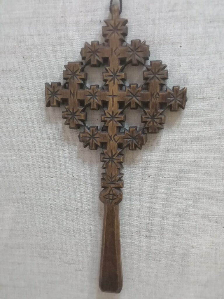 În prima sală a expoziției „Vasile Moldoveanu – 60 de ani în slujba prelucrării artistice a lemnului”, publicul poate admira obiecte de cult, de la cruci de mână folosite de preot în biserică, dar și în afara ei, pentru binecuvântare și cruci de masă sau de altar până la pristolnice sau pecetare purtând însemnele biruinței Vieții asupra morții, „IC XC/ NI KA”, troițe miniaturale și candele.