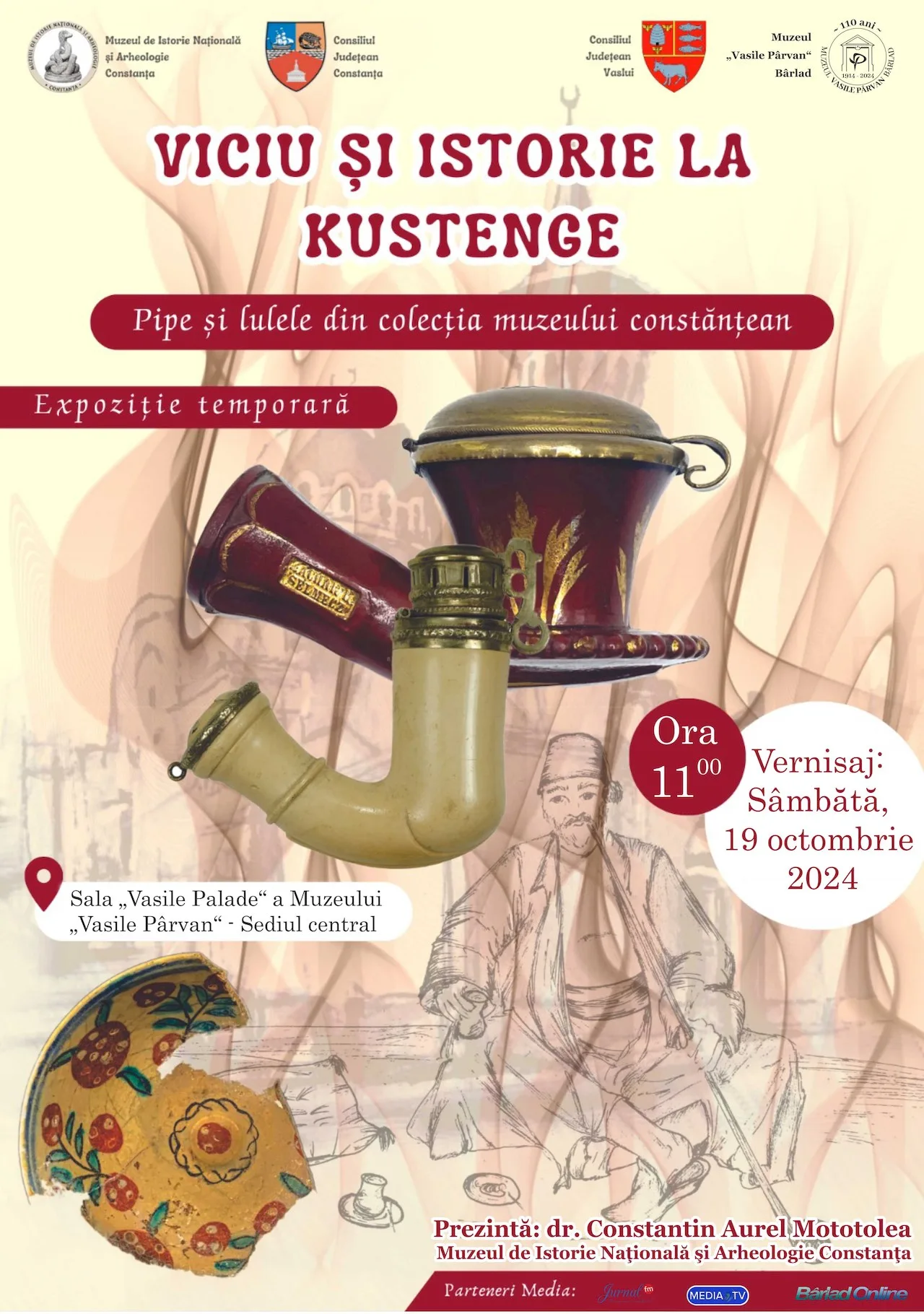 Vernisajul expoziției  „Viciu și istorie la Kustenge” este programat sâmbătă, 19 octombrie, de la ora 11.00, la sediul central al muzeului bârlădean, iar din partea muzeului constănțean va vorbi dr. Constantin Aurel Mototolea.