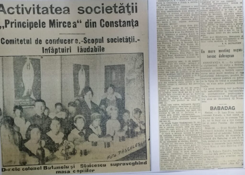 Mărturiile documentare sunt completate cu extrase din presa vremii. Într-un astfel articol de presă, publicat în anul 1933, în ziarul „Dimineața”, este prezentată activitatea filialei constănțene a Societății „Principele Mircea”. Înființată în 1926, filiala de la mare a societății avea sediul pe strada Tudor Vladimirescu, la numărul 31. Aici își desfășura activitatea o cantină socială, care funcționa sub egida asociației umanitare, unde luau masa „peste 120 copii, băieți și fete, dela școlile primare și dela grădinița de copii No. 5”.