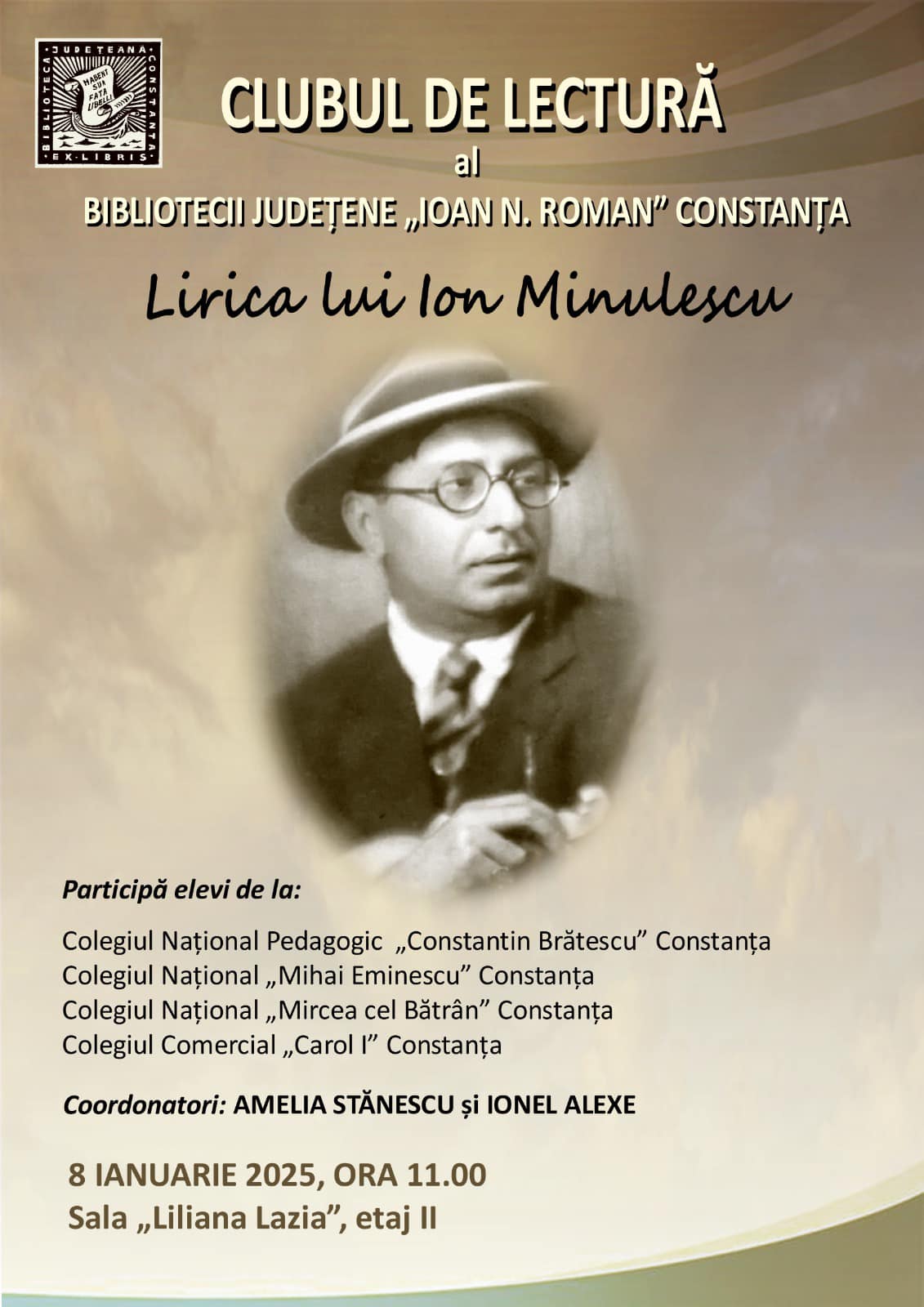 La această a doua ediție a „Clubului”, programată miercuri, 8 ianuarie, de la ora 11.00, în sala „Liliana Lazia”, este așteptat „orice consumator de literatură, indiferent de vârstă, statut, profesie, care nutrește o înclinație aparte pentru lirica scriitorului Ion Minulescu”, după cum menționează organizatorii.
