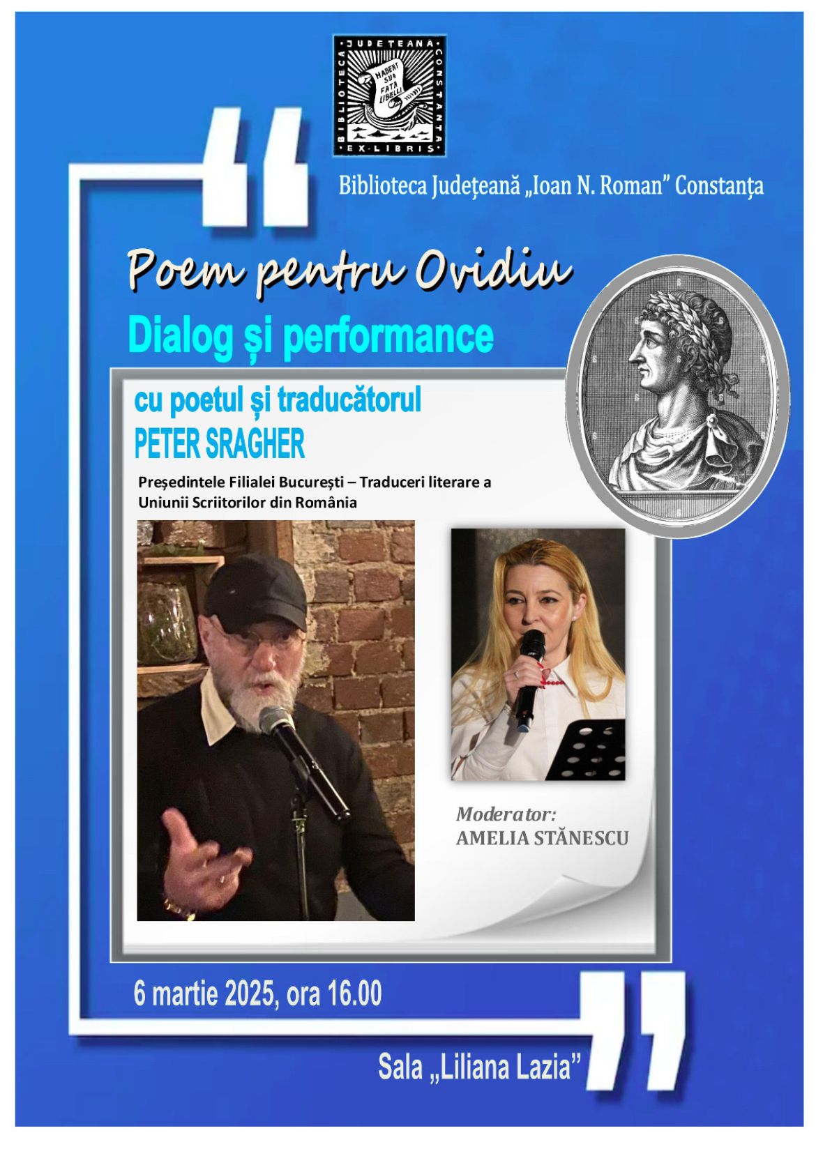 După-amiază, de la ora 16.00, în sala „Liliana Lazia” a Bibliotecii Județene, Peter Sragher va susține o dezbatere și un performance cu tema „Poem pentru Ovidiu”, moderate de dr. Amelia Stănescu, manager al instituției de cultură.