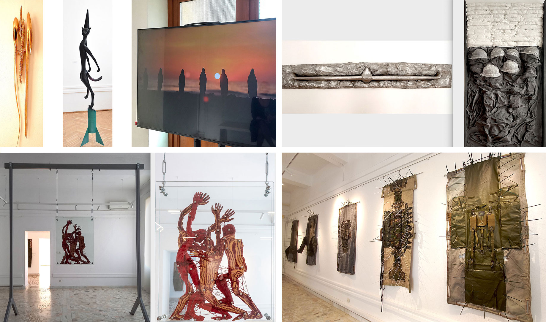 Elena Dumitrescu prezintă două lucrări. În Noi orizonturi (2025, aluminiu), cu o compoziție orizontală, elementul central este un planor, văzut frontal și detașat în relief pe un fundal de nori parcă „brodați” – în realitate, sudați, cu răbdarea și cu minuțiozitatea unui bijutier. La fel de bine, planorul poate fi văzut ca un capitel stilizat sau ca un cap de animal cornut (în care aripile avionului să fie citite vizual drept coarne alungite). Artista mi-a mărturisit că, pentru ea, lucrarea „nu mai este despre război, ci despre transcendere, zbor, desprindere și pace. Moliciunea formei se opune rigidității materialului. Greutatea devine delicată, suspendată și eterică; la fel și forma, simbolul zborului”. Cealaltă lucrare a artistei, de data aceasta cu dominantă verticală, Războiul lui (2019, lemn, rășină, material textil) este o tulburătoare panoplie a morții, în care căștile militare gri, ale unor soldați fără chip, proiectate pe un fundal negru, puternic faldat în multiple direcții aparent necontrolate – sugerând tranșee, mormane de trupuri sau iraționalitatea războiului –, îi reprezintă pe soldații anonimi căzuți pe front. Prin contrast, partea superioară a lucrării introduce un registru de mici pernuțe albe, suprapuse și aranjate perfect geometric. Poate fi o metaforă pentru paturile unui spital de campanie, pentru curățenia și pacea lăsate acasă sau pentru imaginea diafană a paradisului, la care se ridică sufletele eroilor.