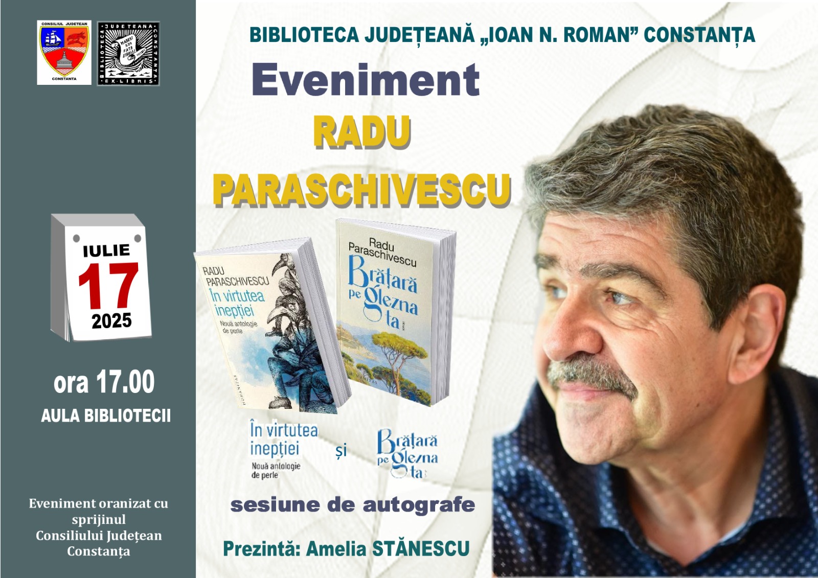 Întâlnirea, programată joi, 17 iulie, de la ora 17.00, în aula instituției de cultură, va fi moderată de managerul Bibliotecii Județene „Ioan N. Roman” Constanța, dr. Amelia Stănescu.