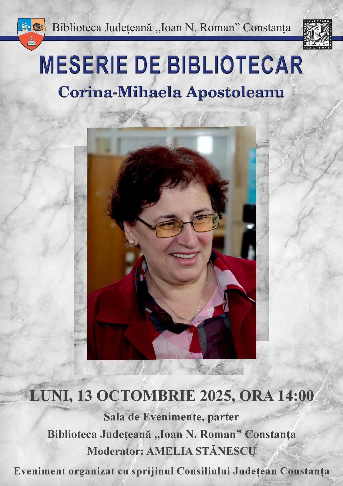 Dr. Corina Apostoleanu, unul dintre profesioniștii remarcabili ai Bibliotecii Județene Constanța „Ioan N. Roman”, este invitata primei întâlniri din seria „Meseria de bibliotecar”.