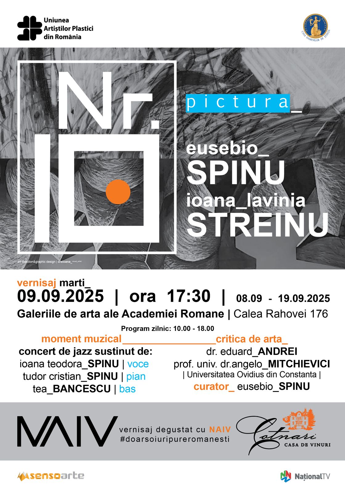 Deși am scris și anul trecut despre artiștii Ioana Lavinia Streinu și Eusebio Spînu (în Tomis / septembrie 2024), îmi face plăcere să revin acum asupra lor, datorită recentei lor expoziții, We Are No. 10, pe care au deschis-o la Galeriile de Artă ale Academiei Române din București. Vernisajul a avut loc în 9 septembrie 2025, sub semnul sinesteziei, căci participanții și-au putut delecta deopotrivă mai multe simțuri: văzul – prin picturile și desenele celor doi artiști; auzul – prin momentul muzical oferit în debutul evenimentului de trio-ul format din cei doi copii ai lui Eusebio Spînu, Ioana Teodora Spînu (voce) și Tudor Cristian Spînu (la pian), și colega acestora, Tea Băncescu (la chitară bass), care au interpretat câteva piese de jazz; nu în ultimul rând, gustul, prin soiurile pure românești din gama Naiv, oferite de Casa de vinuri Cotnari și despre care a vorbit cu aplomb creatorul de brandului, George Moisescu. La vernisajul expoziției au luat cuvântul doi critici: unul de artă, subsemnatul, și unul literar, prof. univ. dr. Angelo Mitchievici, care au adus o dublă perspectivă asupra lucrărilor, într-o abordare interdisciplinară.