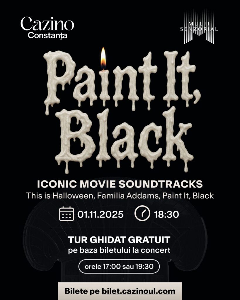 Sâmbătă, 1 noiembrie, la ora 18:30, în sala mare este programat spectacolul Paint it, Black. Halloween edition. Cvartetul de coarde format din Olga Berar – vioara I, Mircea Grigore Lazăr – vioara a II-a, Tamara Dica – violă, Ioana Stanciuc – violoncel va interpreta piese adecvate momentului, din filme și musical-uri celebre, precum This Is Halloween, Familia Addams, Paint It Black, Fantoma de la operă și Nașul. Spectacolul are un dress code – All Black –, iar luminile se vor stinge pentru a lăsa locul lumânărilor. Biletele sunt disponibile AICI. Spectatorii vor beneficia, cu titlu gratuit, în baza biletului pentru spectacol, și de Turul special de Halloween, de la ora 17:00 sau de la ora 19:30.