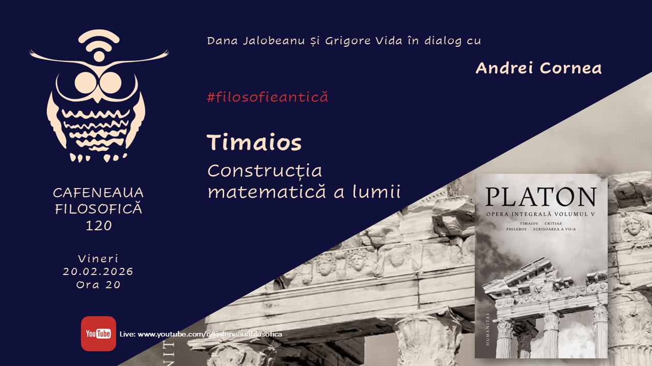 Cafeneaua filosofică este concepută ca o discuție live online, cu cei mai prestigioși specialiști dedicați fiecărei tematici abordate, iar următorul episod, cel cu numărul 120, este programat vineri, 20 februarie, de la ora 20:00. Dana Jalobeanu și Grigore Vida vor fi în dialog cu filosoful Andrei Cornea, traducător și comentator al Operei Integrale Platon, tema propusă fiind Timaios – Construcția matematică a lumii. Timaios este titlul unuia dintre dialogurile lui Platon, personajul principal fiind filosoful Timaeus din Lokroi, care își prezintă viziunea despre cosmos.