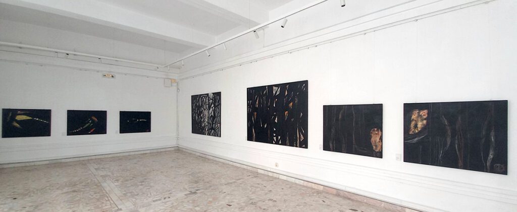 Dominanța negrului în lucrările Emiliei Persu poate fi văzută într-o lungă filiație în istoria artei: de la „picturile negre” ale spaniolului Francisco de Goya pe pereții din Quinta del Sordo (Casa surdului), traducând spaima de dinaintea morții, la fabuloasele Carceri d’invenzione (închisori imaginate) – serie de 16 gravuri cu arhitecturi fantastice, de inspirație livrescă, a italianului Giovanni Battista Piranesi, pe fundalul acelui Gothic Revival al romantismului secolului al XIX-lea –, și până la picturile francezului Pierre Soulages, „maestrul negrului” din secolul XX, care considera că instrumentul său predilect este lumina reflectată de negru, numindu-și demersul outrenoir (dincolo de negru). În spațiul românesc, împăstările cărnoase ale materiei picturale amintesc pe alocuri de o altă artistă originară din Constanța, prematur dispăruta Ecaterina Vrana. Geometriile fruste, în tușe largi, negre, din seria marilor picturi în acrilic pe pânză Overlap (suprapunere) din prima sală își găsesc corespondențe în unele lucrări ale artistei Hedda Sterne din anii 1950, când aceasta descoperea New York-ul ca pe un organism tentacular, sau, mai aproape în timp, în anumite lucrări ale lui Nicolae Comănescu (ca cele din expozițiile sale din ultimii ani, cu clădiri industriale abandonate).