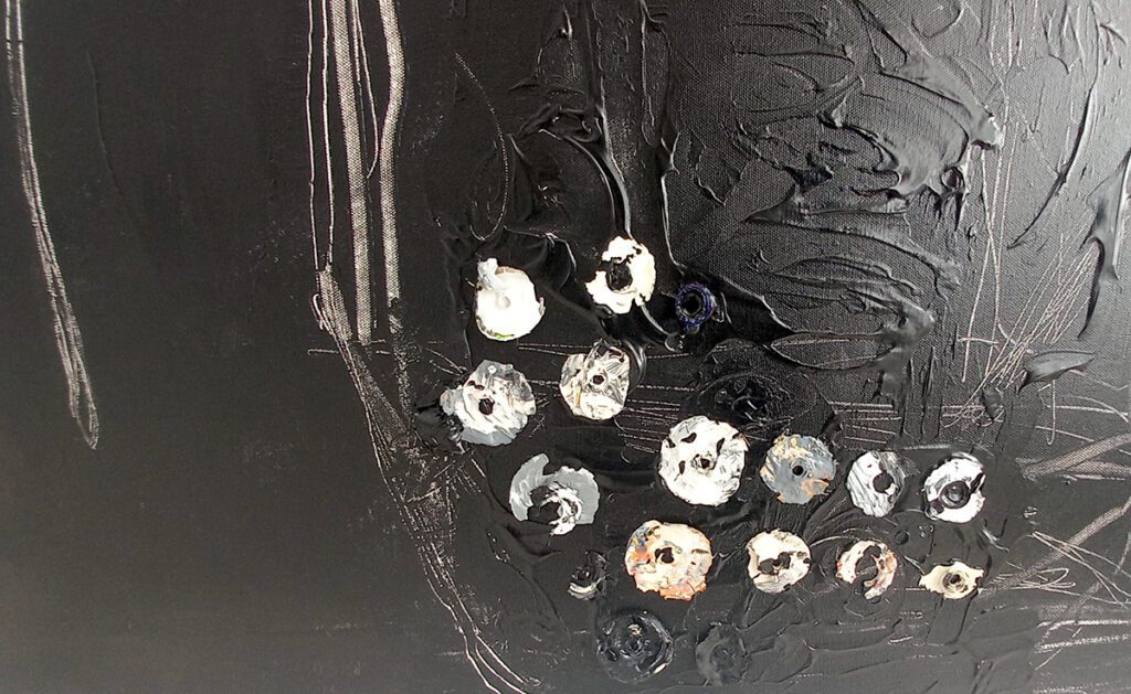 Cutia, așa cum se vede, poate cel mai bine, în lucrarea Unpacked (15_18, acrilic / pânză, 114×146 cm), este prezentă în două ipostaze majore: un cub în perspectivă (în partea dreaptă) – ca obiect nedespachetat – și un cub deschis în partea stângă – ca o cutie desfăcută. Perspectiva este (aproape) izometrică în dreapta, în timp ce în stânga e mimată cu candoare și spirit ludic perspectiva inversă (ca în icoanele și mozaicurile bizantine). Formele liniare se definesc prin incizii, care fac vizibil albul pânzei, sau prin trasee grafice fluide cu pastă albă, suprapuse peste fondul negru. Într-o lucrare din aceeași serie, Unpacked (14_18, acrilic / pânză, 103×141 cm), cutia cubică pare prinsă într-un fel de plasă care se scurge din partea superioară și dezvăluie o parte a conținutului, un fel de forme circulare, albe sau de diverse nuanțe, aplicate în relief, ca niște capete de tuburi de culori.