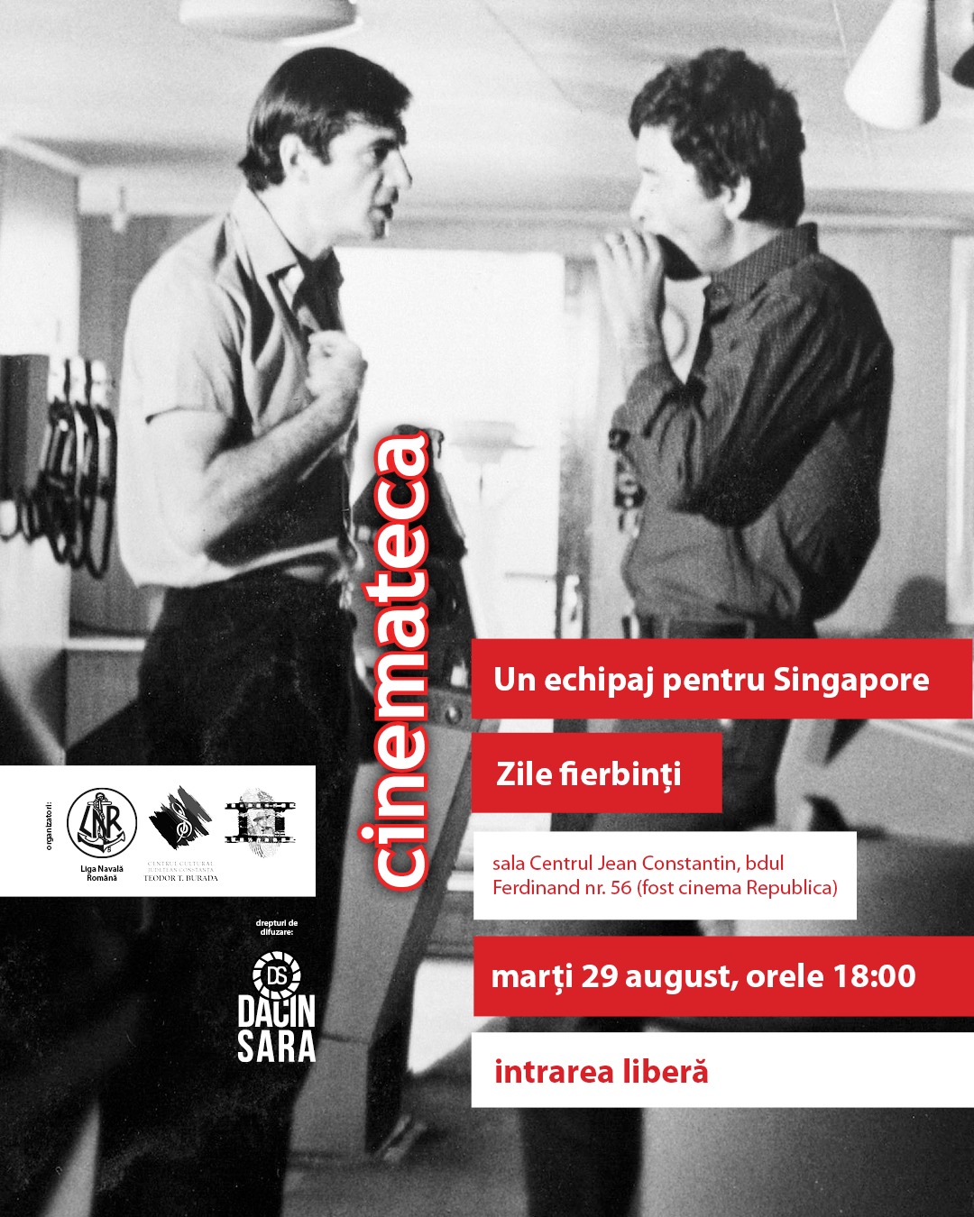 „Zile fierbinți”, filmul românesc din 1975, regizat de Sergiu Nicolaescu, cu Vladimir Găitan, Ileana Popovici, Marga Barbu, Mircea Albulescu în rolurile principale și „Un echipaj pentru Singapore” filmul din 1982 regizat de Nicu Stan, cu actorii Gheorghe Cozorici, Florin Zamfirescu și Mariana Mihuț în rolurile principale vor fi proiectate mâine, marți, 29 august, de la ora 18:00, la Centrul Multifuncțional pentru Tineret „Jean Constantin”.
